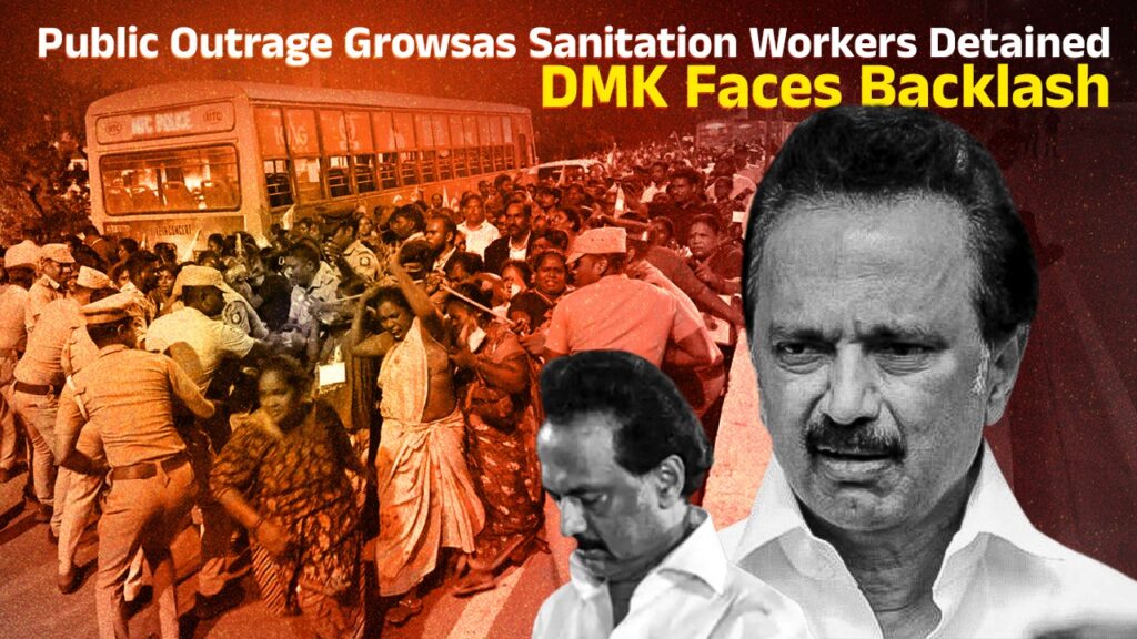 Chennai witnessed growing anger and unrest as over 200 sanitation workers were detained by the police during a protest demanding job regularisation. The incident has added fuel to the already mounting criticism against the DMK government, which is being accused of ignoring the concerns of the working class. Many social activists and opposition parties are now terming this as another example of administrative arrogance under the ruling DMK — a sign of the DMK fall in public trust. The detained workers, previously employed under the Greater Chennai Corporation (GCC) through the National Urban Livelihoods Mission (NULM), were protesting near the zonal offices in Royapuram and Thiru.Vi.Ka Nagar. Their demand was simple — job security and fair wages. However, instead of dialogue, they faced police action. The protesters were led by members of the Uzhaippor Urimai Iyakkam (UUI), who said that the workers were only asking for their rightful employment after months of uncertainty.